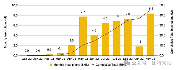在序号和BRC-20**推出后的最初疯狂之后,市场在再次升温之前有所降温。11月份的活动显着复苏,成为有史以来**的月份,总登记量超过8,300,000次,比10月份的低点增长了362%。