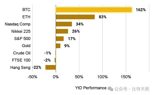鉴于这些发展,比特币的表现优于许多其他主要资产和指数,包括传统资产和加密货币。截至2023年12月5日,BTC市值同比上涨162%。2024年BTC的一些最重要的发展包括以下内容。