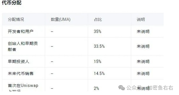Token 经济目前UMA**的现状是:**供应量115,679,854个UMA,发行量74,365,172个UMA,发行量为64%。现在的价格是1.52美元。UMA项目于2020年初发布,峰值价格为43美元。考虑到目前的价格水平,可以观察到价格已经从峰值下跌了95%以上,因此可以认为已经进入了价值投资范围。在**分发方面,创始人持有33.5%的**,而未来的**销售额占14.5%。这种分布可能被认为是相对较高的,值得关注。
