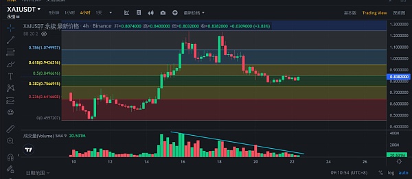 XAI 币,价格跌至斐波那契回撤的0.382附近,成交量递减,多空量能衰减,开始有筑底的迹象了。