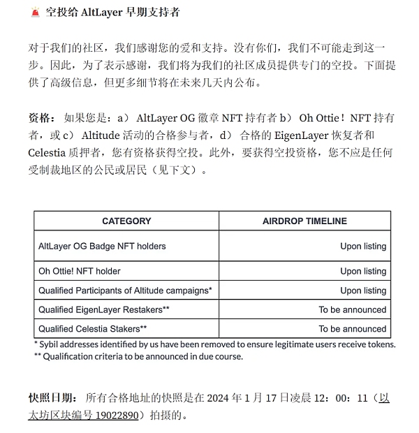 AltLayer已于1 月 17 日 12:00:11 AM(以太坊区块高度 19022890)完成快照。 空投对象包括AltLayer OG Badge NFT 持有者、Oh Ottie!NFT 持有者、Altitude 活动合格参与者、合格的 EigenLayer 再抵押者和 Celestia 质押者。