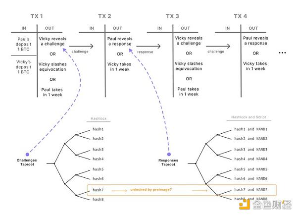 与 BitVM 的思路类似,QED Protocol 将脚本组成逻辑电路,从而在 BTC L1 上对提款交易的 ZK proof 进行了验证,这类逻辑电路将包含 1000 个 UTXO,虽然实现了直接验证,但成本耗费巨大。