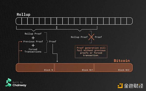 Chainway 的证明者需要一个不漏地扫描每一个 BTC 区块。从 BTC 区块中读取区块头,上一个的 zk proof,以及区块中刻入的“强制交易”,才能生成一个完整的 ZK proof。每一个 BTC 区块中,Chainway 都会提交一个刻录 ZK proof 的交易,从而形成递归的证明。