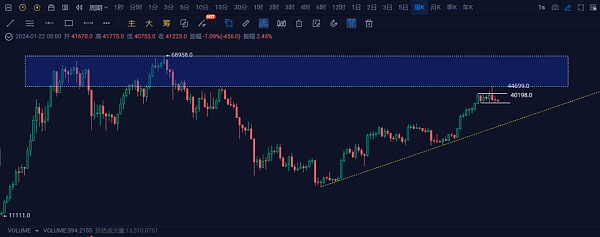 2、目前BTC还在40000-44600美金这个震荡区震荡,周线的走势来看,40000美金的这个支撑位几次下探都没有下去,说明下方支撑很强。