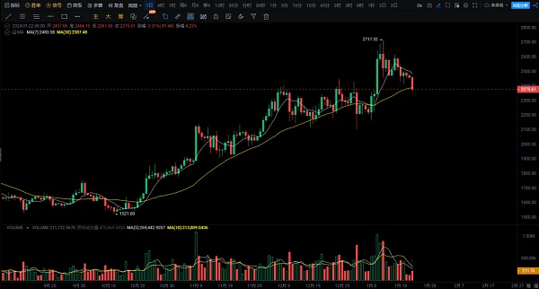 以太坊的盘面KDJ虽然出现缩量,但BOLL和MACD整体还是走强的;主图MA三日各均线也是保持震荡上涨趋势,那么就今天日内以太坊的下跌很明显了是受到了比特币的影响,所以我们就以太坊目前的情况低点关键支撑就参考在周线MA5和MA10日均线区域,当前价格参考在2374-2321区域附近,这轮受到比特币的空头情绪所产生的跌幅,只要其无法有效跌破2374-2321区域则后续币价还将触底回弹拉升(也就是怎么跌下来将怎么回弹回去);反之若低点支撑区域被有效跌破了,那么大盘情况将会产生**的变数,后续以太坊可能会**随着比特币进行崩塌下泄,低点目标也就随之下看至日线的BOLL下轨区域附近,大概价格参考在2200-2127区域附近(不过就以太坊目前大级别的走势而言,跌破的概率是比较低的)。