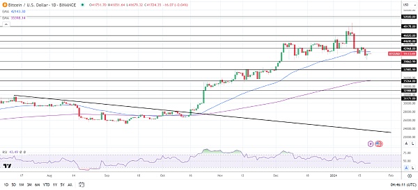 14日RSI读数为43.49,表明比特币在进入超卖区域之前会跌至39861美元的支撑位。