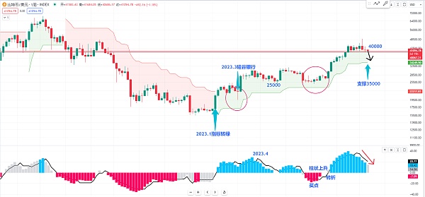 那我认为你如果担心的话可以将空单平仓一半 或者我有可能会选择防守上周我给大家讲到的箱体高点44.4K 当做空单的防守 那也可以看比特币到底会不会跌破这个40000 因为按照以往的经验来说 他如果真的跌破了这个40000 我们去观察一下他下一步有没有可能再去支撑回撤这个超级趋势指标这条绿色的线