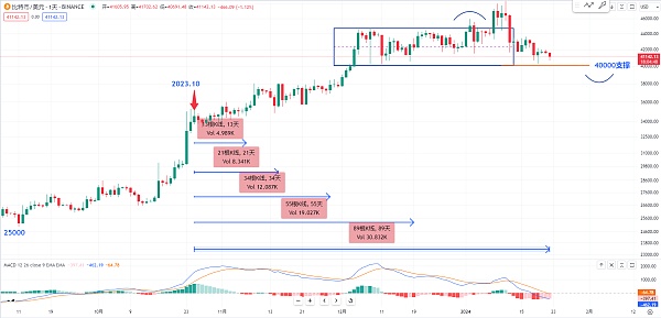 就是从2023年的10月份的这一根K线开始 后面都存在着一个斐波拉契数列 每一次转折向上的一个走势 然后今天是1月22号 也是89的一个时间转折 所以目前的这个位置**是能够撑住 而且在日线级别里面这个40000的关口到底能不能守住其实我心里也没有底