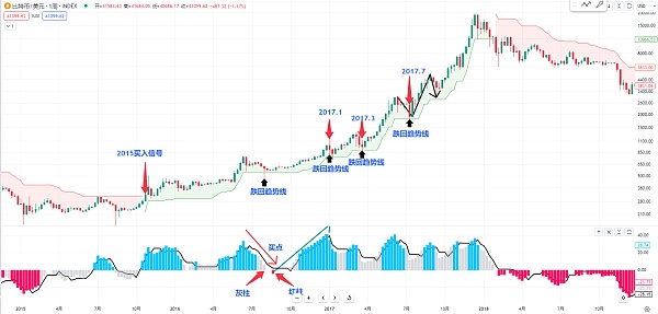 或者我们可以再观察一下比特币在2015年到2017年的牛市 这里面每一次买点的位置看起来是不是非常的清晰 我们可以观察一下2015年比特币超级趋势指标 出现买入的信号 后面是一**从来都没有转红过 他是一直在呈现上升的结构