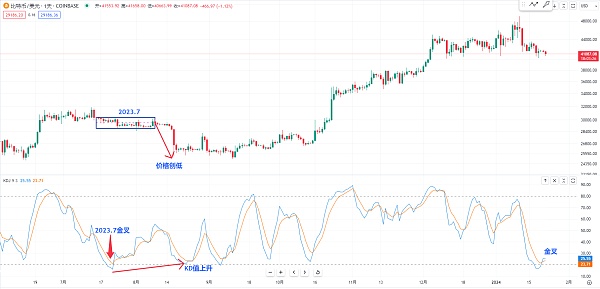 那现在也是一样 kd在20附近也是有金叉 或者我们观察一下当时在2023年7月这个位置也是有一些上涨的高点 不过**是在这个位置崩盘的时候 就是kd指标在背离 我们可以观察一下 价格在创新低 然后下方的kd之前的数值是和后面的数值在呈现一个上升的走势