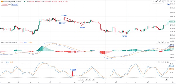 比如我们观察一下比特币在2023年的7月份 我们可以观察一下 他当时从32000跌到了这个位置 差不多是在29000附近 我们可以看到下方的macd是去了这个零轴下方 或者是kd在20左右也是有金叉