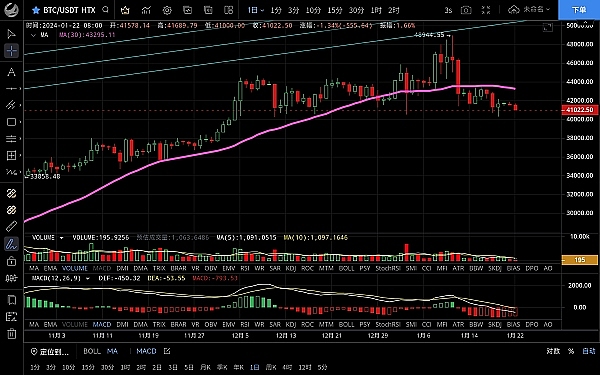 大饼昨日行情波动不大整体呈震荡走势,高位触及41870一线受阻,随后震荡下行,**跌至41064一线支撑,恭喜跟上昨日思路的朋友空单盈利,目前币价在41200附近运行,四小时级别行情再次触及ma30均线受阻,k线连阴下行,macd多头缩量双线粘合,短期走势空头还未止跌仍有下行的风险,下方先关注40500-40000,若跌破4w关注38000可以分批**,日线级别整体呈震荡下行走势,碎步反弹大阴下跌,可见空头力度强势,思路建议反弹高空为主低多为辅,上方压制41800-42300,下方支撑40300-40000