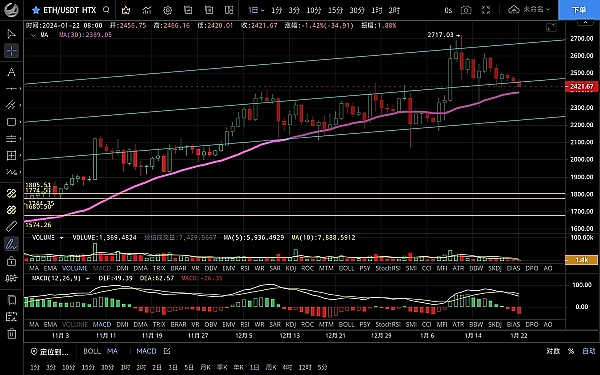 以太坊昨日走势与大饼一致,整体呈震荡走势,凌晨空头发力连阴下行,**跌至2424一线支撑,恭喜跟上昨日思路的朋友空单获利,目前币价在2427附近运行,四小时级别行情横盘震荡后选择下行,k线三连阴,macd空头逐步放量双线有死叉迹象,短期走势空头没有止跌还有下行的需求,关注2400关口支撑情况,预计会有一波插针迅速反弹,激进可以抢一波,日线级别整体呈下行走势,日内有试探ma30的风险,macd空头逐步放量双线死叉向下,整体走势较为弱势,下跌不可怕这样才有机会**,以太坊市场是好的,只不过暂时被大饼拖累了,日内思路建议回踩支撑后先多后空,上方压制2450-2480,下方支撑2400-2350