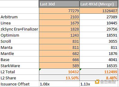 他们占总 Gas 消耗量的比例呈上升趋势。Dencun 的 EIP-4844 会改变一些事情,但以下是上述时间范围内的数字: