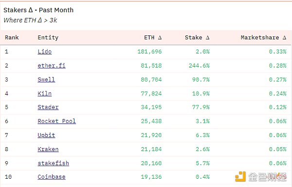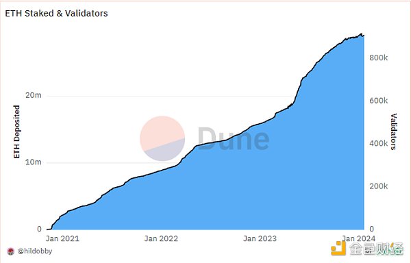 另一方面,大量新的 ETH 被质押,其中很大一部分是由 Eigenlayer 驱动的(稍后会详细介绍)。