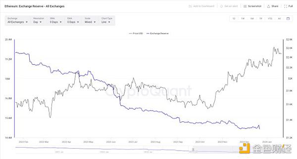 接下来我们来看交易所余额。我们可以看到,在过去的一年里,交易所上的以太坊数量从1960万下降到**的1490万。