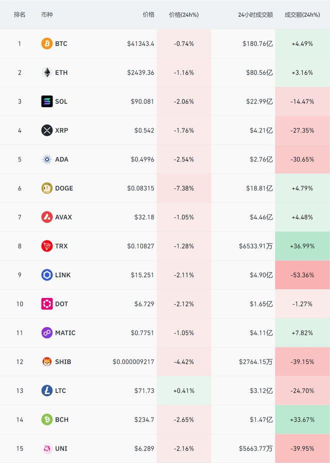 比特币(BTC)过去24h下跌0.24%,**报41870美元,**报41266美元,波动率增加至1.46%。以太坊(ETH)过去24h下跌1.13%,走势弱于BTC,**报2481美元,**报2435美元,波动率1.88%。