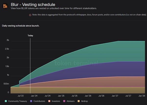 图 1 显示了 $BLUR **的归属时间表。除了空投之外,大部分供应量将在 6 个月的锁仓后,在 4 年内逐渐释放。这些数字在**的市场叙事中相当常见。在 2021 年牛市周期中,通常的归属期限在 12 至 18 个月。进入本文的正式主题,如何为我们的早期投资者和贡献者设计正确的归属条款?