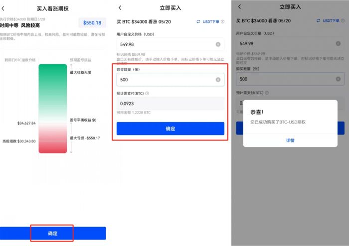 3)选择好期权合约后,二次确定该合约的时间、风险等信息,之后输入购买数量,确定后即委托成功。