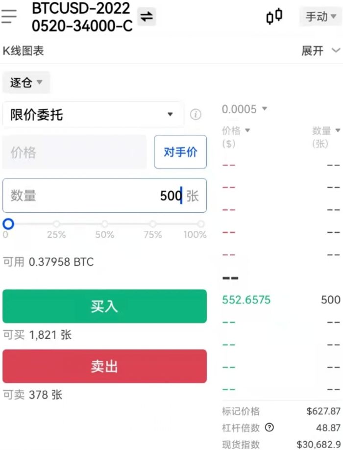 期权合约类型解释:BTCUSD(标的资产) – 20220520(到期时间,为当天16:00 HKT) – 30000(执行价格) – C(C表示看涨,P表示看跌)。