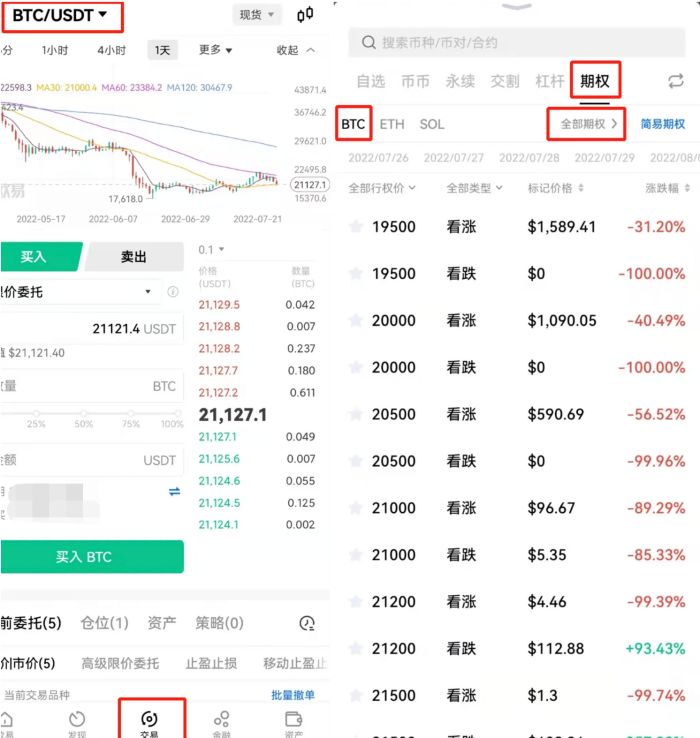 欧易提供以比特币(BTC)、以太坊(ETH)为标的资产的期权交易,当您交易账户资产总价值大于5万美元时即可买卖看涨期权和看跌期权。若您未开通期权交易,可先通过模拟盘体验期权产品,也可以选择期权简选模式购买期权。
