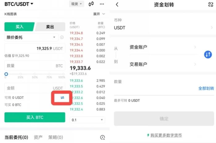 在交易页面,点击划转按钮。选择币种,以【BTC】为例—从【资金账户】—到【交易账户】—输入划转【数量】—【确认】。