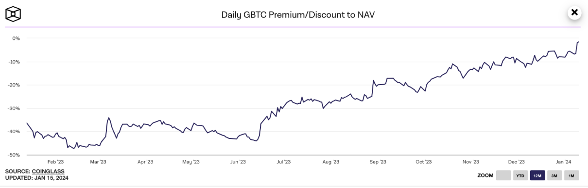 这也就相当于二级市场上的 GBTC 价格很便宜,例如在 2022年底,BTC 价格当时15700,GBTC 价格为 8600,相当于可以在二级市场买到 6 折的 BTC 现货,这些打折买入 GBTC 的用户,现在要卖出获利盘从以锁定收益。