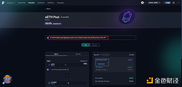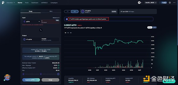 Pendle 是一个去**化利率交易市场,提供 PT(Principal Token,本金**)和 YT(Yield Token,收益**) 的交易。我们使用 Pendle 中的 YT 交易就可以加速获取 ether.fi 和 EigenLayer 的积分。