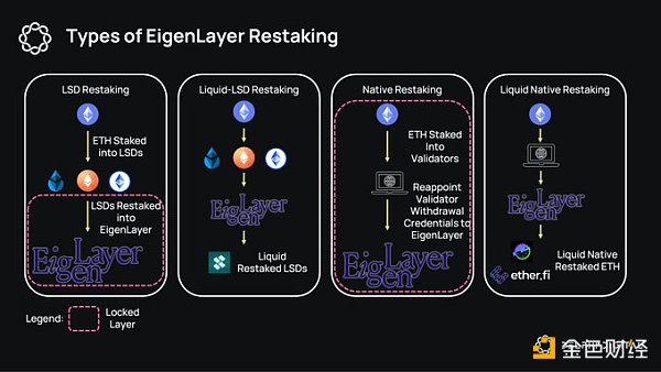 再质押赛道不只有 EigenLayer,Restaking 叙事下的衍生项目也有很多机会,简单介绍一下 Restaking 的四个种类: