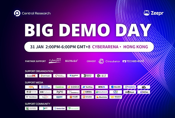 本次“Big Demo Day”将于1月31日举办第十期,是由Zeepr 总冠名,Central Research、Tec** News联合主办、数码港、852web3支持举行的大型线下活动。Big Demo Day集结了Web2和Web3行业精英聚焦香港市场。