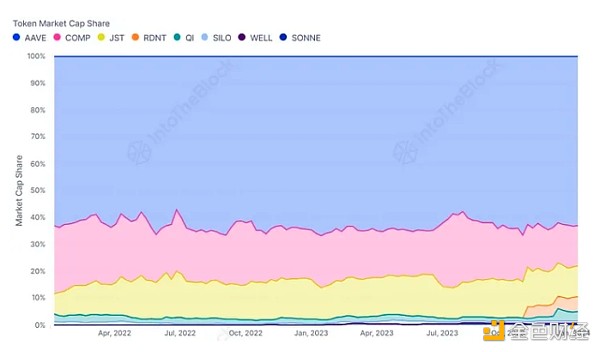 作为TVL**的协议,**VE**在与其他借贷**相比的市值份额上一直保持着主导地位。尽管市场上出现了新的协议,如Aave的分叉Radiant,但**VE一直保持着超过60%的市场份额。与此同时,其他协议,如Compound(COMP)和Justlend(JST),在新进入者涌现的情况下更容易失去市场份额。