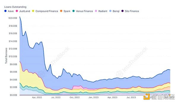 尽管2022年几乎所有协议的总锁定价值(TVL)都出现了显著下降,但到2023年底,TVL流回到借贷中。这一趋势可能表明用户开始相信熊市已经达到**点,从而**了杠杆头寸被清算的风险。随着用户对价格走势越来越乐观,有可能看到资金流入上升,用户通过借款来加大他们的头寸。