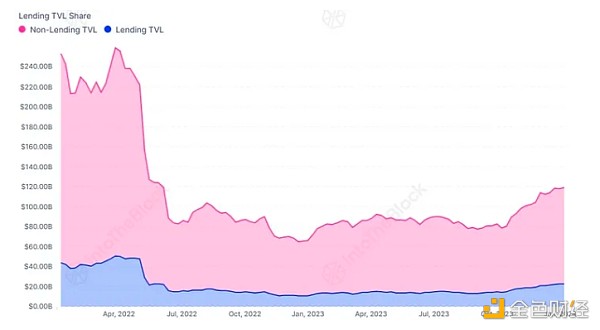 **协议类别已经创造出自己的利基,并与整个市场相比保持了相对稳定性。**协议的TVL比例一直保持稳定,占DeFi整体TVL的15-20%。这表明,即使在熊市中,借贷资产仍然存在**的用例和需求。