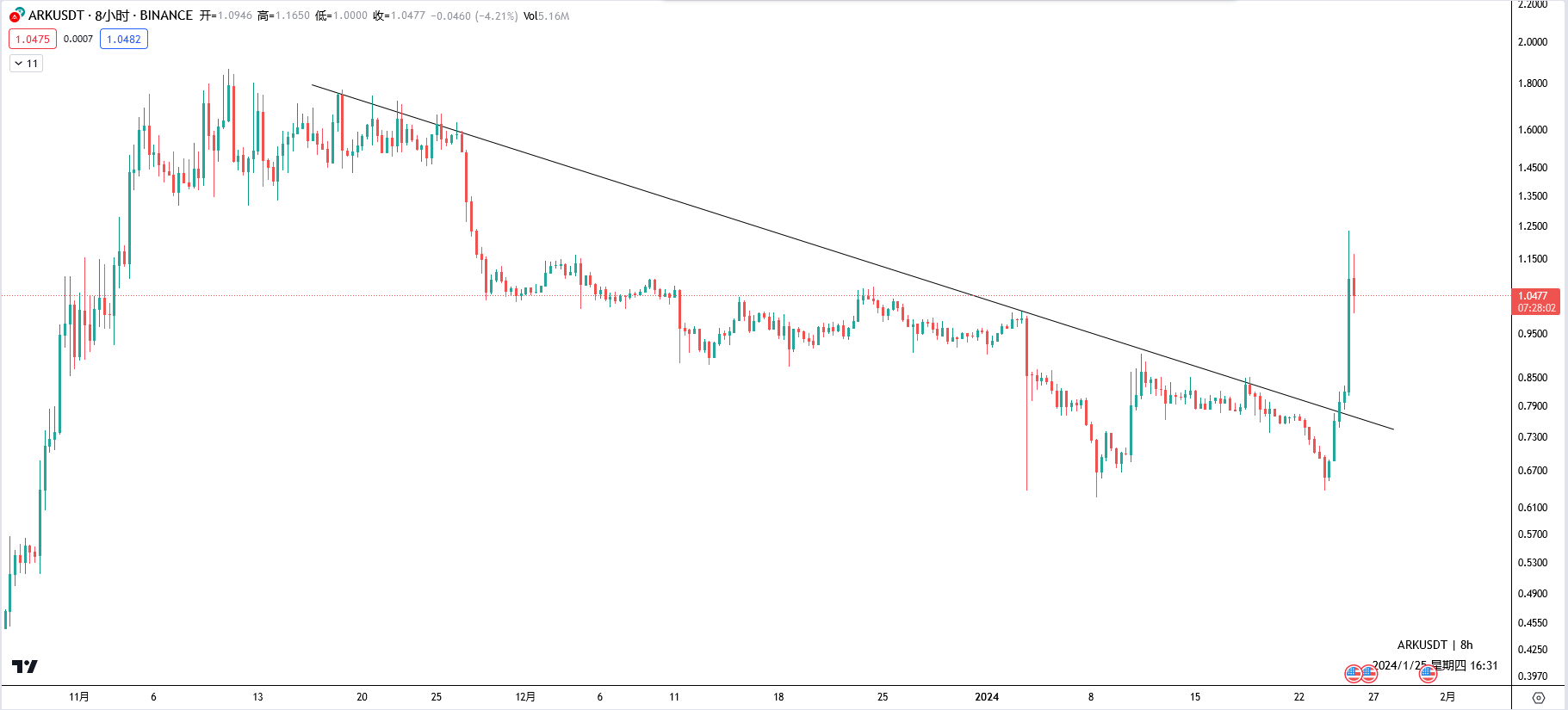 已经突破了趋势线,并拉出了一根大阳线。这时候已经不宜追高了,需要观察小级别(1小时或以下)走出的结构。根据结构是(上涨)中继形态还是反转形态,来决定做单的方向。