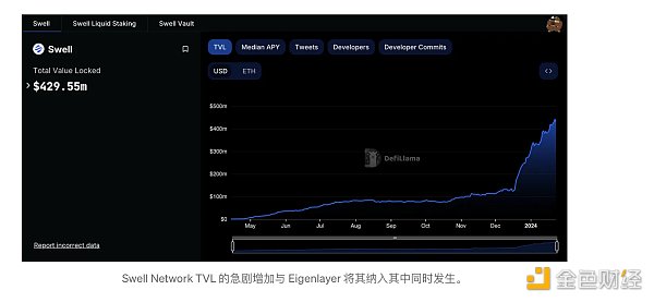 最初只限于三种 LST(stETH、cbETH 和 rETH),然后 Eigenlayer 开放了新的 LST。这就是 Swell Network **取得突破的地方。他们能够进入新的 LST 列表,耕种 EigenLayer 的需求如此之大,以至于将其 TVL 推到了新的 LST 上。