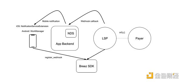 Breez SDK 方法的工作原理如下:首先,开发人员创建一个 Webhook,LSP 可以在付款过程中调用该 Webhook。一旦付款到达作为收款人之前**一跳的 LSP,LSP 就会通过 Webhook 调用通知传送服务 (NDS),NDS 会向用户的手机发送带有说明的推送通知。开发人员需要以设置 NDS 的形式进行一些跑腿工作,但结果是更好的用户体验,因为用户不需要将应用程序保留在前台即可接收付款。它还使移动用户能够使用静态地址(例如闪电地址、LNURL-Pay 或 BOLT12)接收付款。