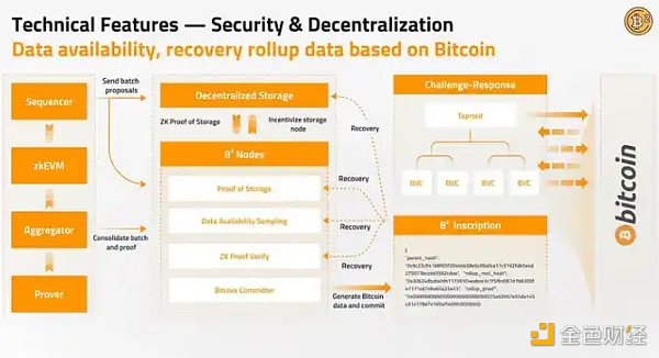 数据可用性层包括分布式存储、B²节点和比特币网络。该层负责**存储 Rollup 数据的副本,验证 Rollup 的零知识证明,并**在比特币上执行**确认。