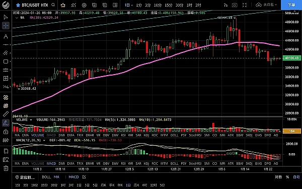 大饼昨日反弹上行**触及40300一线受阻回落,低位跌至39550支撑反弹,恭喜跟上昨日思路的朋友多单获利700点,目前币价在40158附近运行,四小时级别底部支撑逐步抬高行情震荡上行,再次触及ma30均线压制,虽短期受阻但macd多头运行双线金叉向上,目前来看走势偏向多头,突破上行的概率较大,日线级别走势呈震荡向上,指标呈空头向下,方向相悖不适合入场,技术面来看回调并没到位,预计还会回调洗盘,然后再走拉升,后市关注ma120支撑情况可以轻仓**,破位则关注35000区域,思路建议逢低做多为主高空为辅,上方压制40500-40100,下方支撑39500-39000