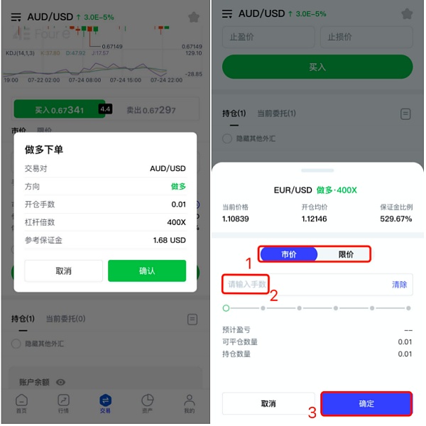 2.交易下单。选择【买入】或者【卖出】,市价或者限价,输入开仓手数进行下单。