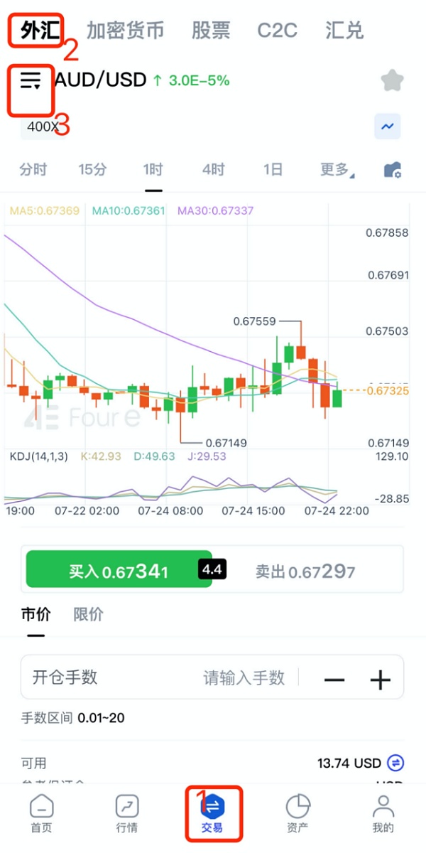 1.选择交易对。点击4e APP下方【交易】,选择【外汇】交易对。
