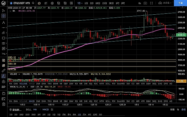 以太坊昨日白盘走出一波回踩,低位跌至2196一线止跌反弹,晚间行情一路上行**触及2283一线受阻,恭喜跟上低多思路的朋友,目前币价在2270附近运行,四小时级别受大饼影响行情跟着拉伸一波,反弹力度不算大,短期突破震荡区间,macd虽呈多头金叉状态,但延续性不强,上方承压明显有回踩需求,短期先关注2250支撑情况,日线级别ma7拐头向下,整体走势依旧偏弱,若大饼不涨以太坊势必会再次回踩,做多找强的,做空选弱的,后市思路如上文,以低多为主高空为辅,上方压制2280-2300,下方支撑2250-2220