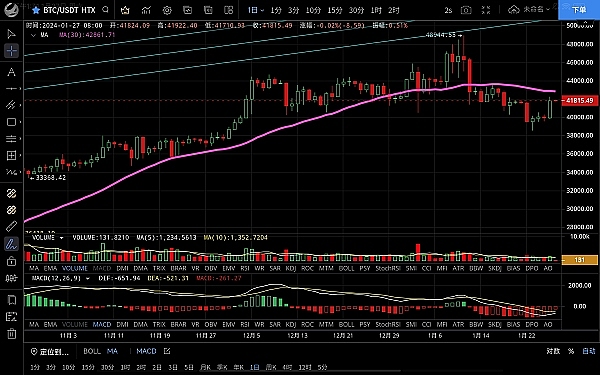 大饼昨日白盘波动不大,给人一种要回踩的错觉,低位跌至39900一线支撑,晚间行情直线拉升突破多个阻力,**触及42250附近受阻回落,恭喜跟上低多思路的朋友,目前币价在41870附近运行,四小时级别行情底部震荡后选择上行,ma7拐头向上与均线形成多个金叉,macd多头逐步放量双线金叉共振,可见多头力度强势,走出一波不小的反弹,短期受阻回落,个人认为回踩还没结束,预计反弹后会再次震荡回落,多次洗盘后才会再次拉升突破新高,下方位置还是关注上文所说ma120均线附近,若跌破则关注35000区域,大方向还是很看好的,思路依旧是低多为主高空为辅,上方压制42300-42800,下方支撑41500-41000