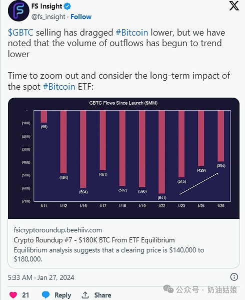 彭博社分析师 James Seyffart 指出,这是 GBTC 自交易**天以来流出量**的一天。周五(第 11 天),GBTC 流出量达到 2.551 亿美元,使该基金的累计流出量达到约 50 亿美元。