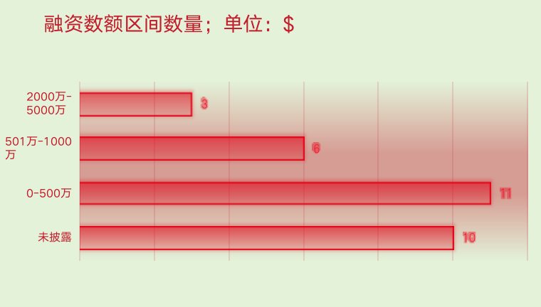 10家未披露;11家融资数额在0~500万美元;6家融资数额在501万美元~1000万美元;3家融资数额在1001万~5000万美元;