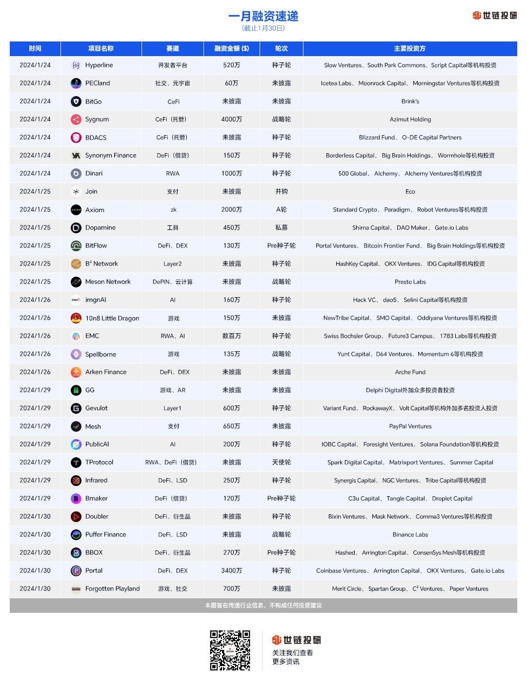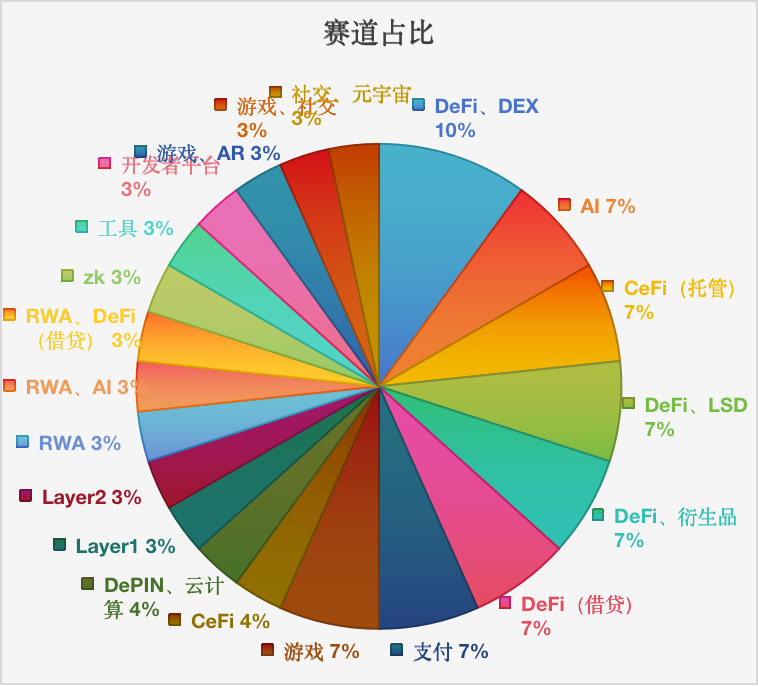 本期融资事件中,涵盖开发者平台、社交、元宇宙、CeFi、DeFi、RWA、支付、zk、工具、DEX、Layer2、DePIN、AI、游戏、Layer1、LSD等热门赛道;