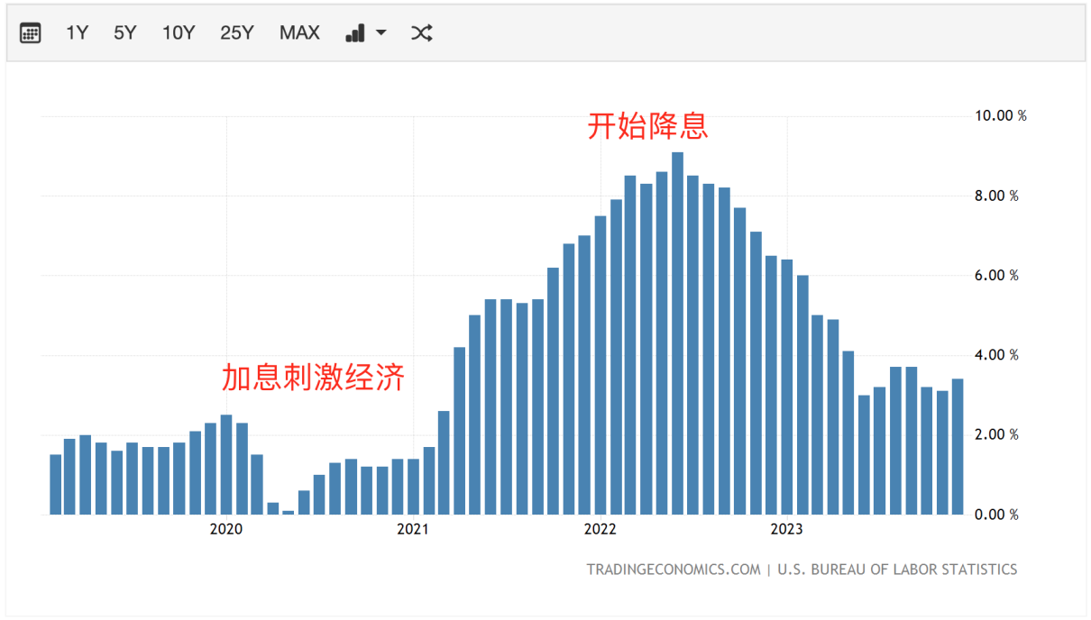 当 CPI 过高时,美联储就会加息,相反,当 CPI 增长过低甚至出现负增长时,美联储就会降息以**经济,而加息或降息则会影响风险资产的价格波动。
