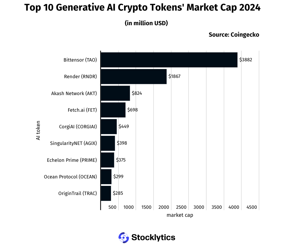 随着人工智能成为了热门话题,「区块链 AI」也成为加密货币市场投资者关注的赛道,根据Stocklytics.com数据,目前市场中与生成式AI相关的**市值已超过120亿美元大关。