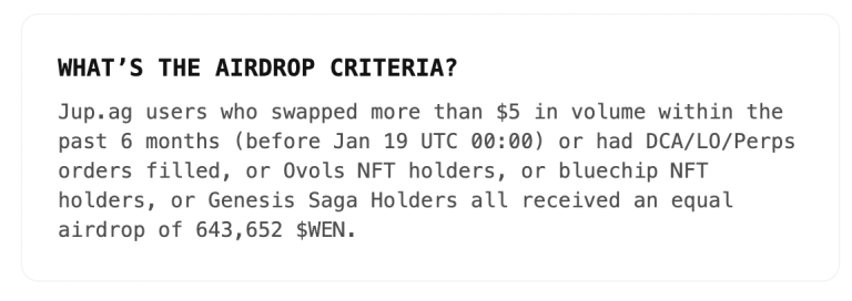 据WEN官网,用户必须在今年1月19日之前的六个月中,在Jupiter上交易至少5美元才有**,蓝筹NFT持有者(未说明),NFT项目Ovols及Genesissaga的持有者也能申领。