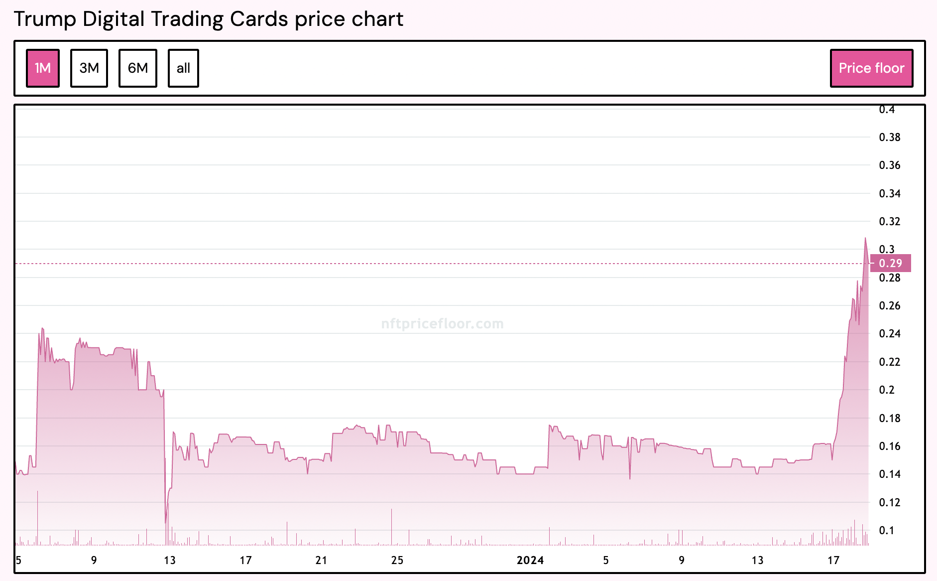 另一方面,据NFTPriceFloor数据显示,特朗普最初发行的Trump Digital Trading Cards NFT目前地板价为0.29枚ETH,随着近期特朗普赢下党内初选,NFT受此消息影响,地板价上升近30%。