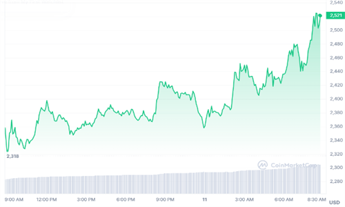 在批准之后,以太坊的价格飙升了约3%,达到2500美元以上,这是自2022年5月以来的**次。在发布时,以太坊的交易价格为2533美元,在过去24小时内上涨了7%。